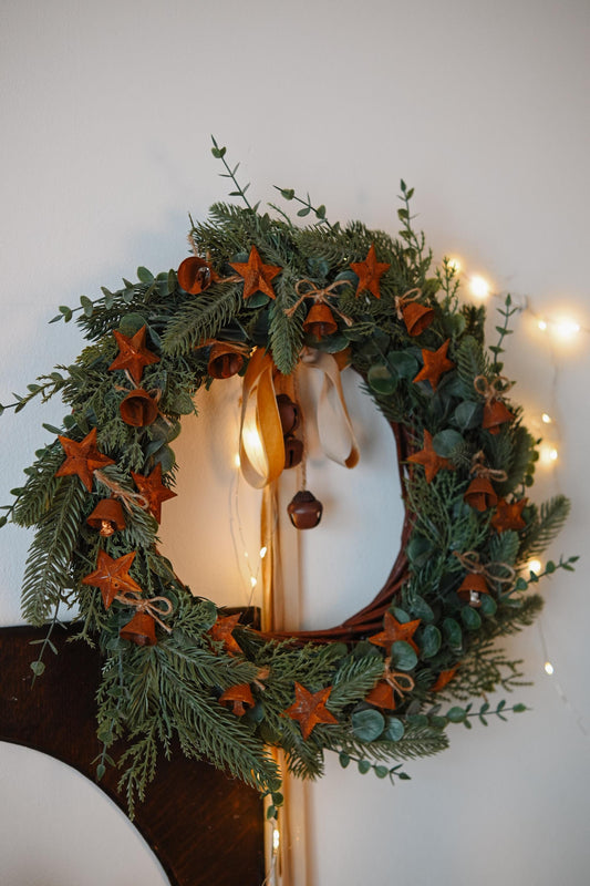 Front door Christmas wreath, flowers rustic outdoor decor