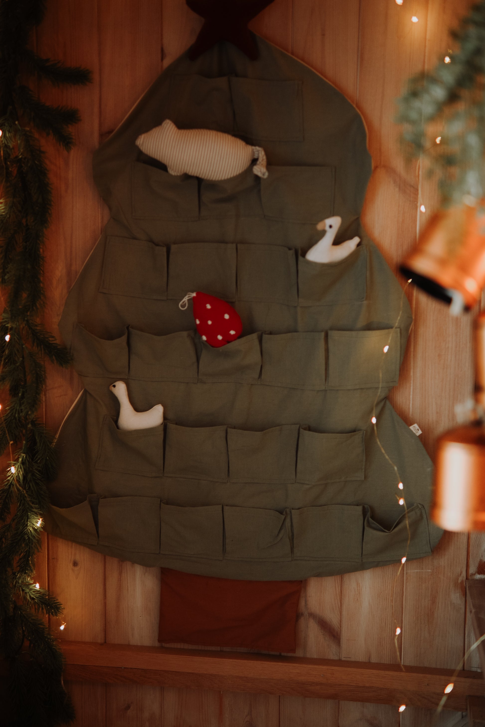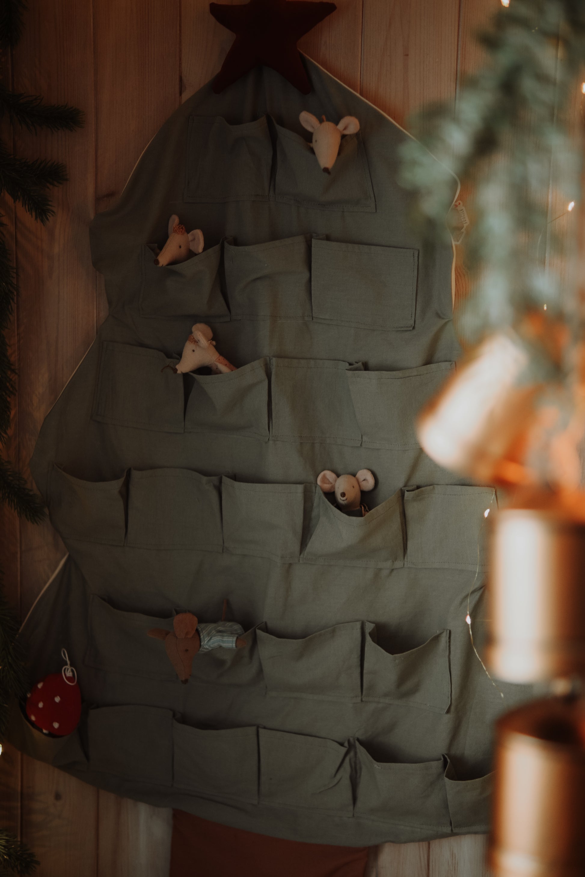 This beautiful green fabric Christmas tree advent calendar for kids is a festive and functional holiday decoration, designed to delight children year after year. Measuring 100 cm in height and 50 cm in width at the base, it features 24 pockets, each 10 cm wide and 8 cm high, perfect for small toys, decorations, or collectible mice.