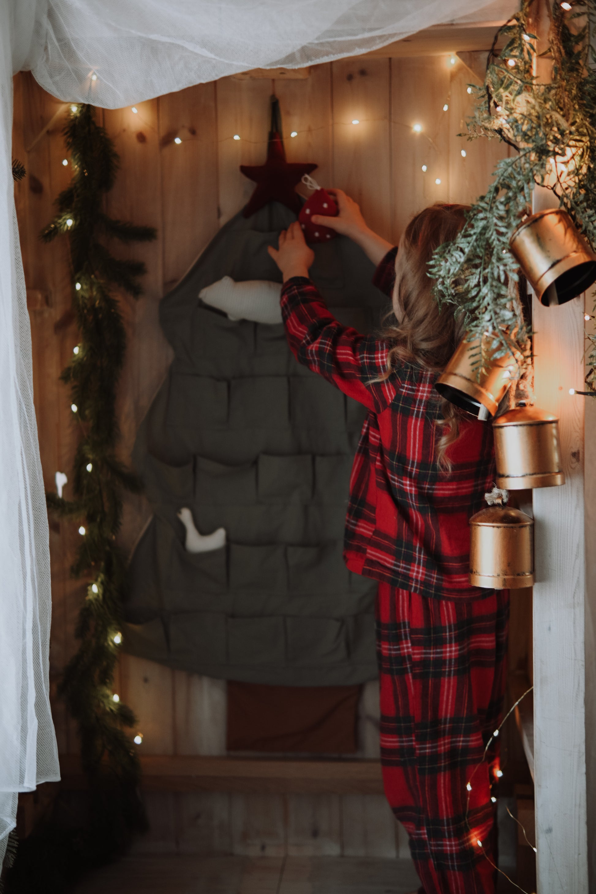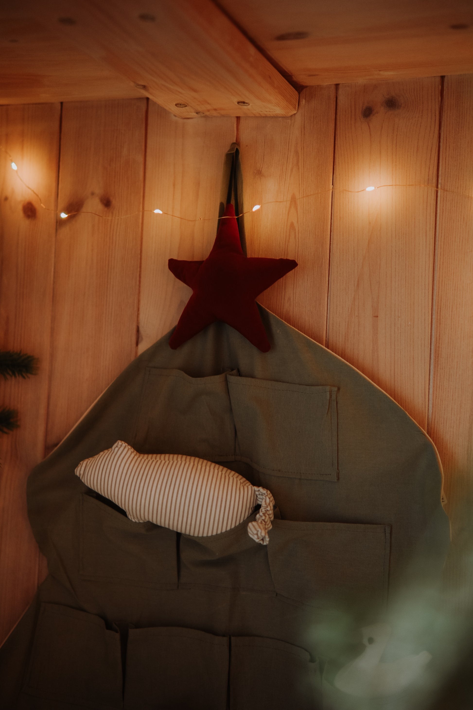 The advent calendar is thoughtfully crafted with a soft lining and reinforced edges for durability. The removable red star topper adds a charming finishing touch and comes with an elastic loop, allowing it to hang from the wall or a Christmas tree. The calendar includes a sturdy wooden rod hidden in a back pocket for stability, ensuring it remains secure when displayed.