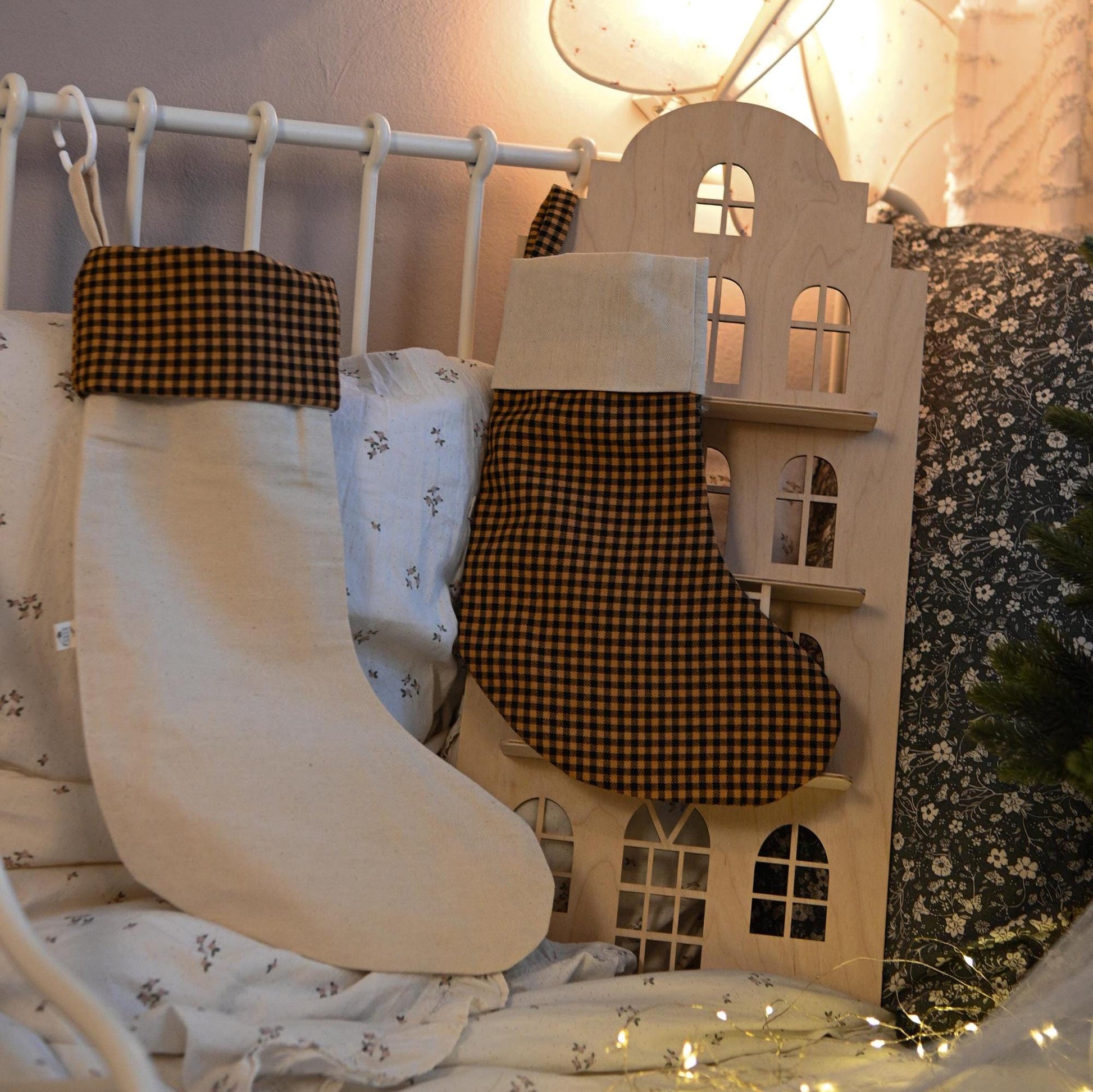Hanging by the fireplace as a charming holiday decoration