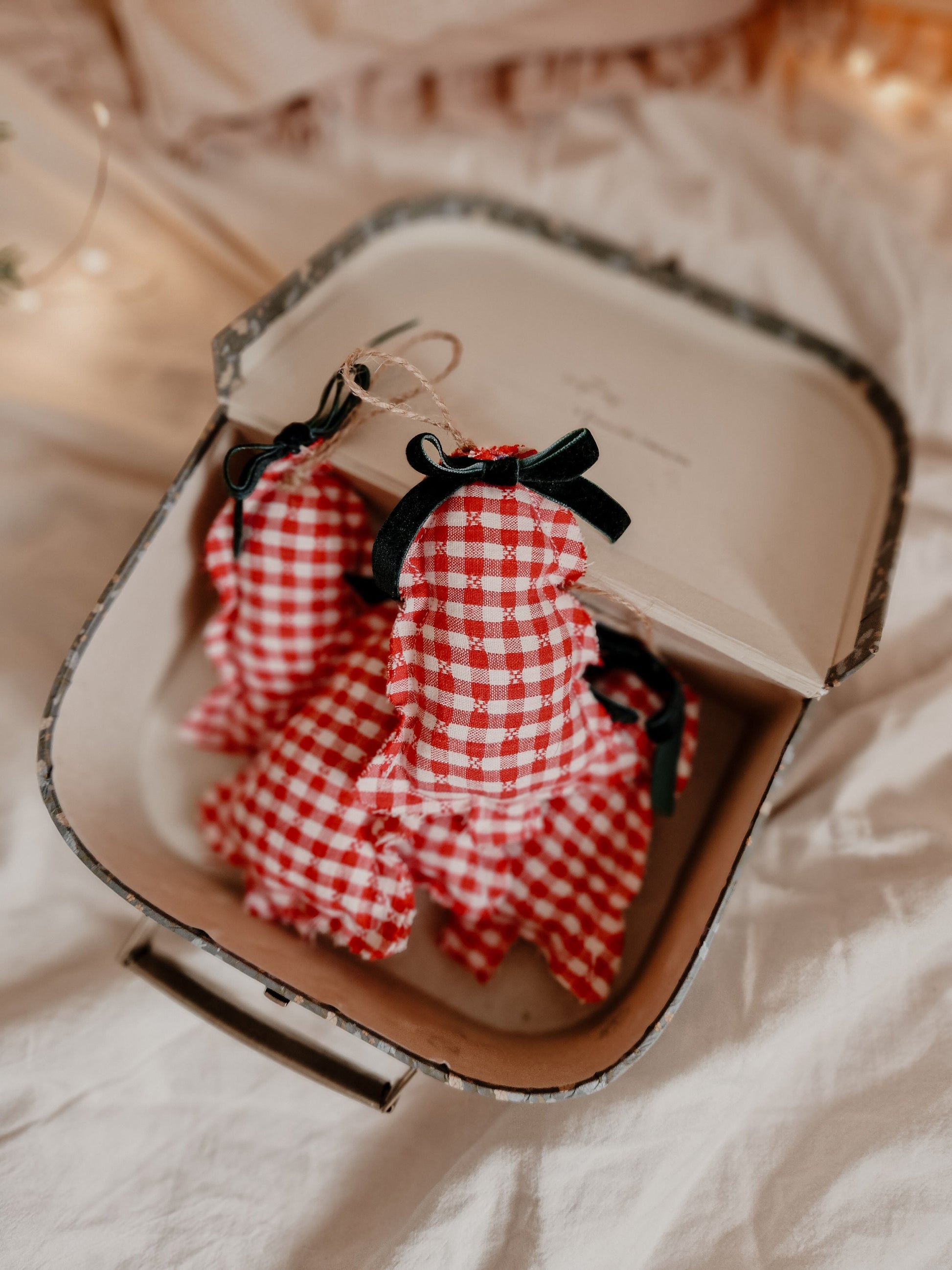 Transform your Christmas tree into a cozy, festive wonderland with our handmade cotton ornaments. These charming red checkered Christmas tree decorations add a warm, whimsical touch to your holiday decor. Perfect for both nursery-friendly spaces and traditional holiday settings, these eco-friendly ornaments bring nostalgia and sweetness to your celebrations.