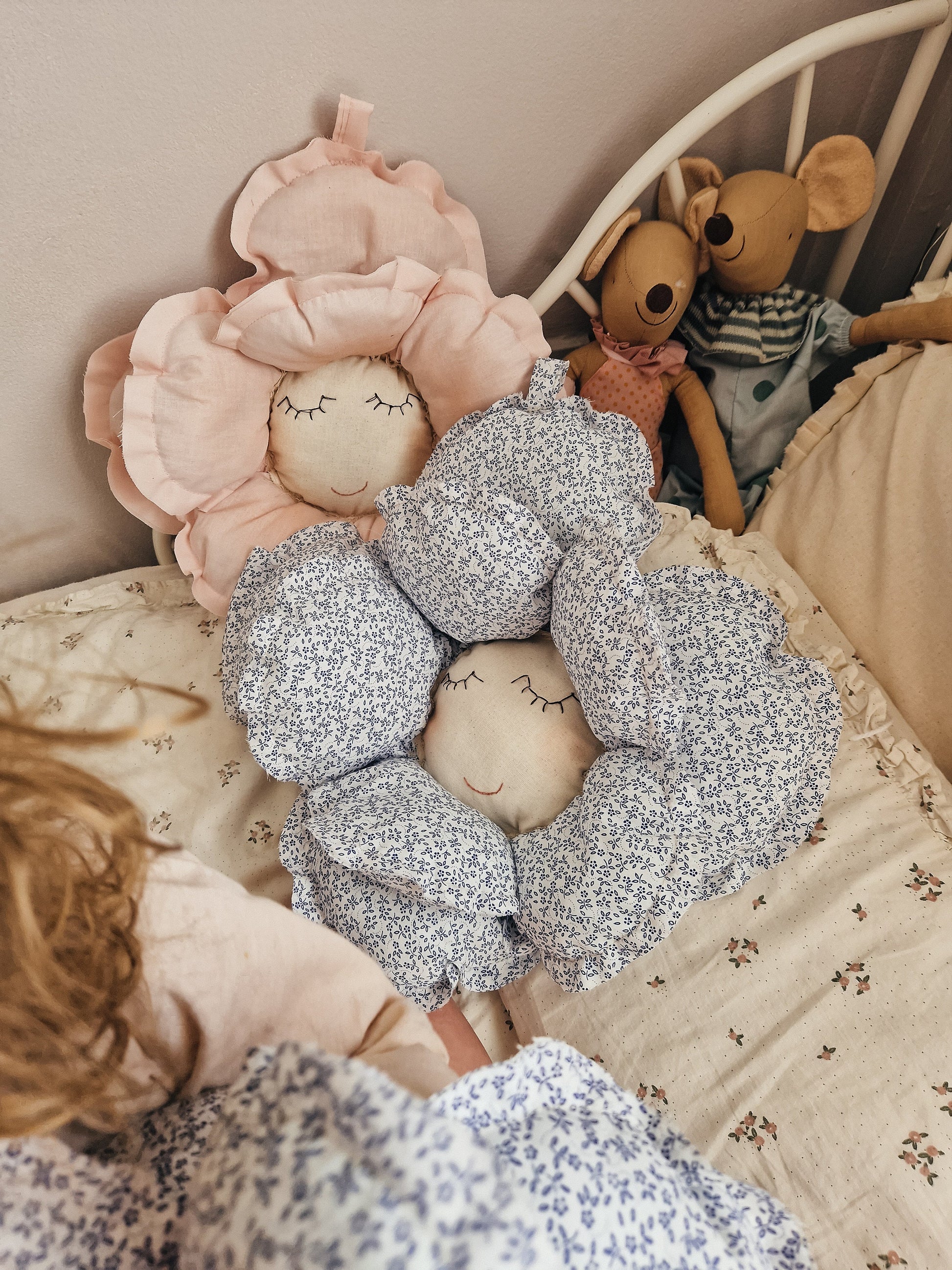Handmade pink flower pillow and wall decoration – the perfect boho nursery decor. Use as a baby pillow, floral wall hanging or a charming shelf accent.
