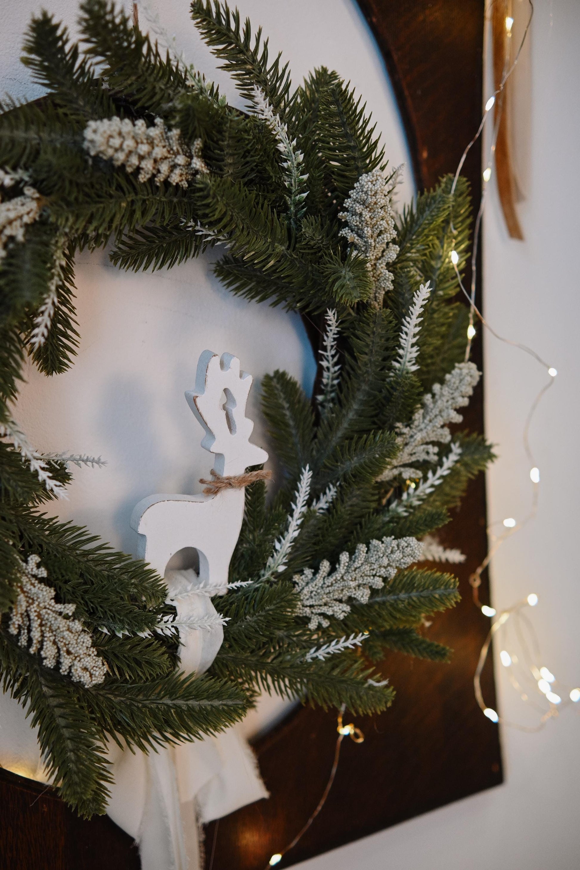 Christmas Front Door Wreath – White Deer Wreath, Rustic Holiday Decor, Winter Wreath with Green & White Branches