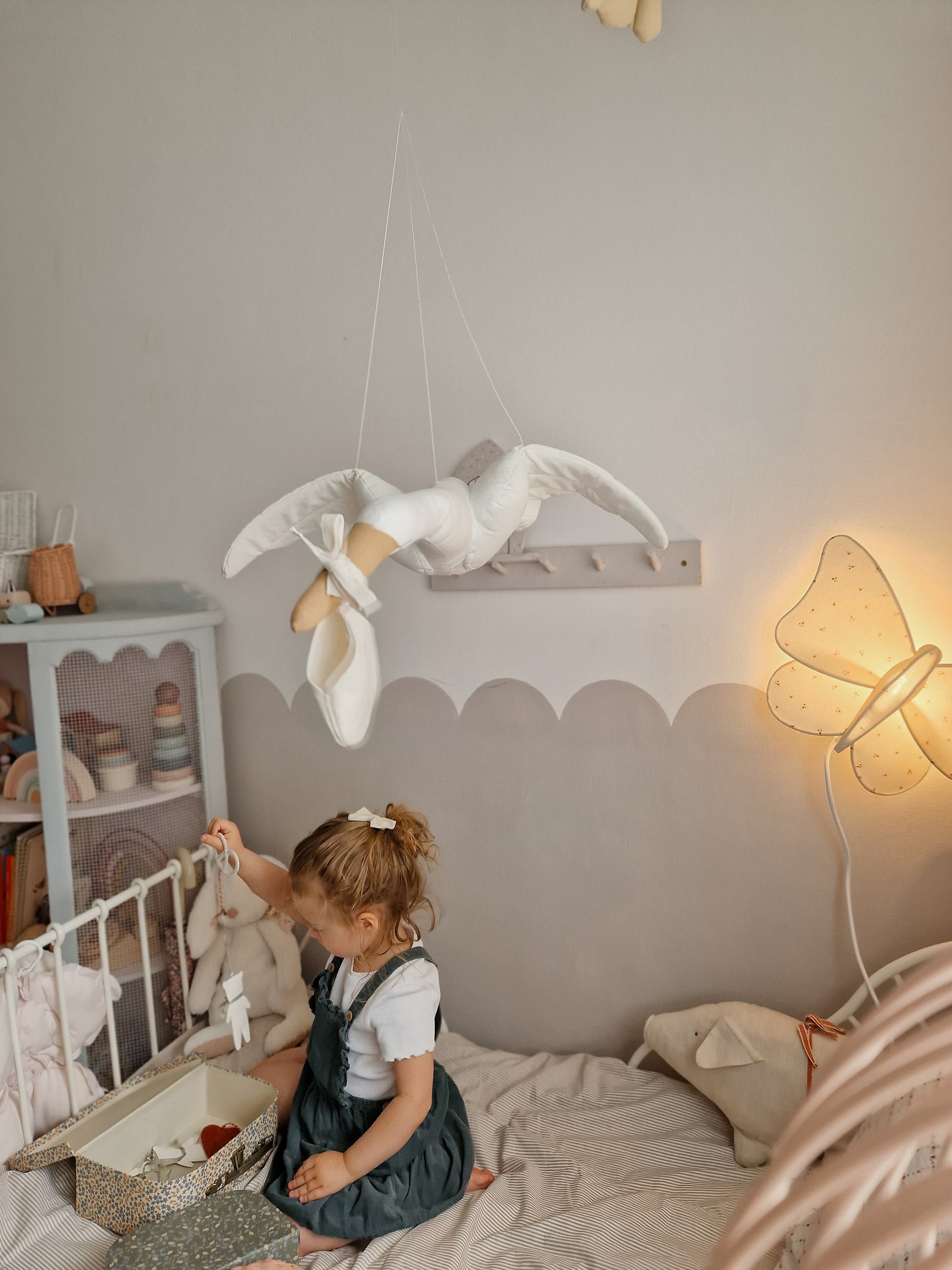 Bring elegance and whimsy to your nursery with this Hanging Flying Swan. A beautiful addition to any baby's room or playroom, this plush bird pillow not only serves as a decorative accent but also doubles as a charming soft toy. The delicate design of the white swan, combined with a sweet, small handbag tied around its beak, symbolizes the arrival of a new baby—making it a perfect gift for baby showers or a unique nursery decoration.